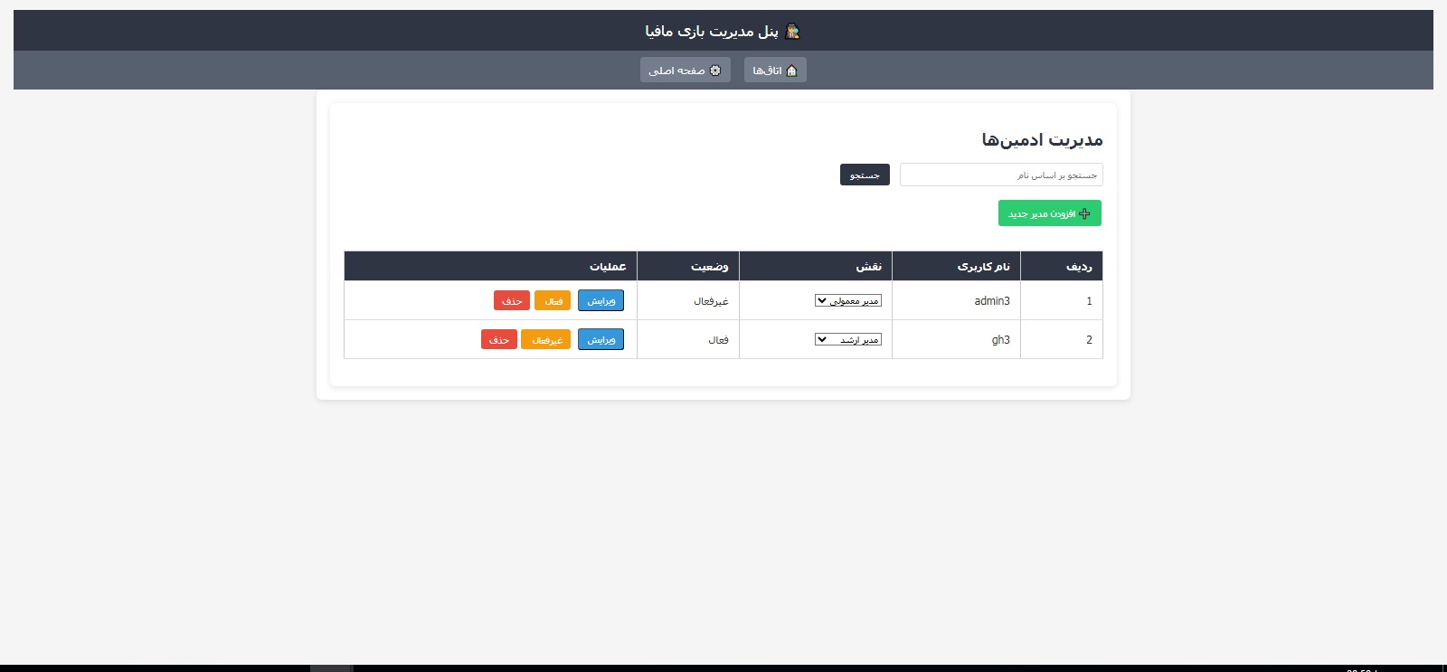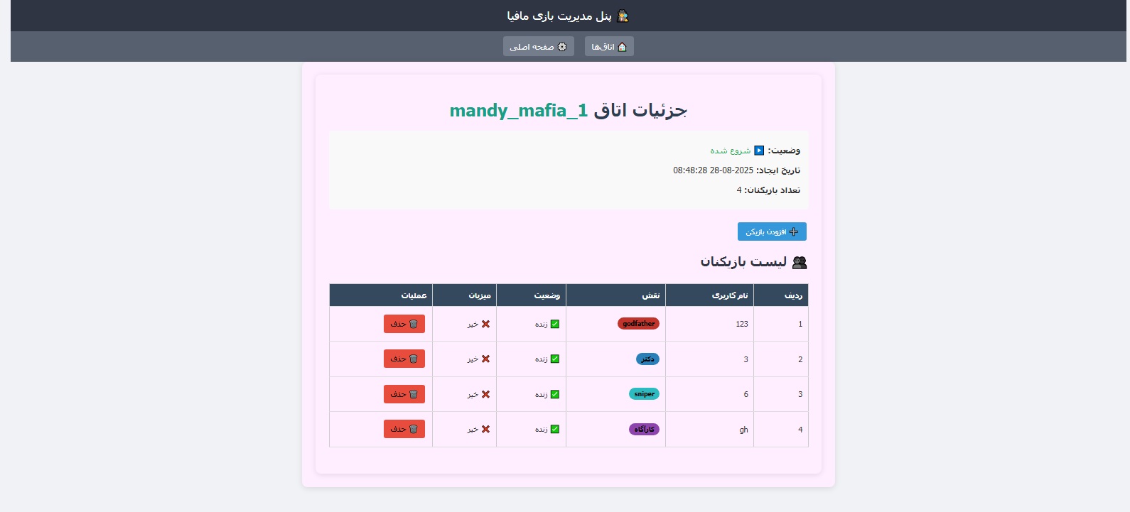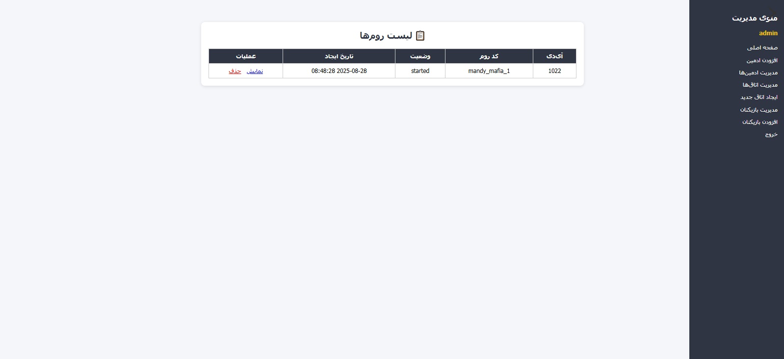 - مدیریت جامع اتاقها: مشاهده تمام اتاقهای فعال، تاریخچه بازیها، جزئیات هر بازی (بازیکنان، نقشها, برنده) و امکان حذف یا تعدیل آنها.